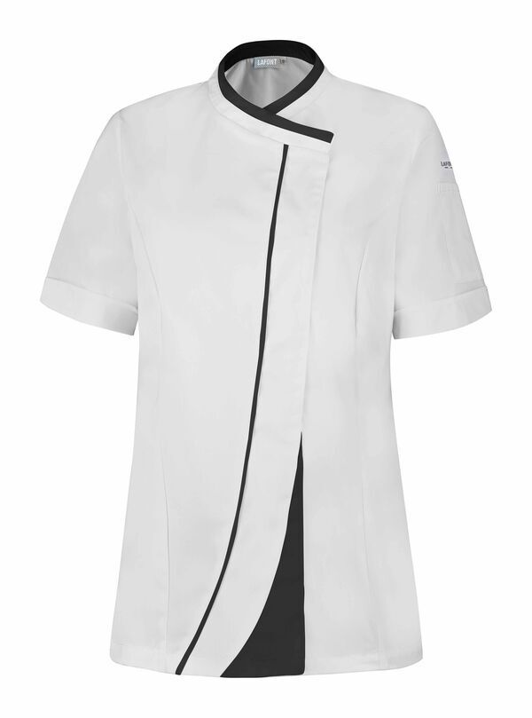 Veste femme à effet double col. Fermeture croisée par grippers cachés, double empiècement milieu dont angle bas contrasté et biais contrasté sur toute la hauteur. Découpes princesse sur devant et dos. Fentes côtés renforcées par un twill jacquard. OEillets d'aération brodés sous bras. Manches courtes. Bas de manches à revers. Coupe ajustée.