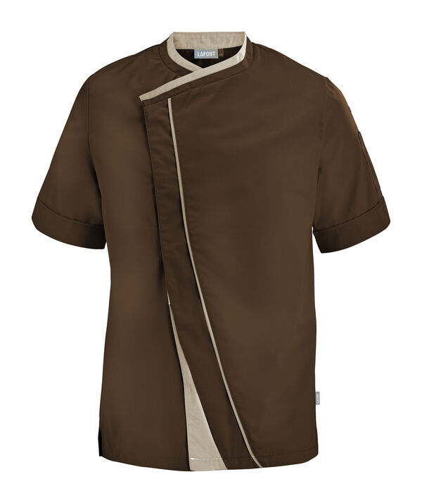 Veste homme à effet double col. Fermeture croisée par grippers cachés, double empiècement milieu dont angle bas contrasté et biais contrasté sur toute la hauteur. Fentes côtés renforcées par un twill jacquard. Oeillets d'aération brodés sous bras. Manches courtes. Bas de manches à revers.