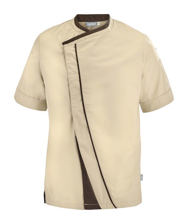 Veste homme à effet double col. Fermeture croisée par grippers cachés, double empiècement milieu dont angle bas contrasté et biais contrasté sur toute la hauteur. Fentes côtés renforcées par un twill jacquard. Oeillets d'aération brodés sous bras. Manches courtes. Bas de manches à revers.