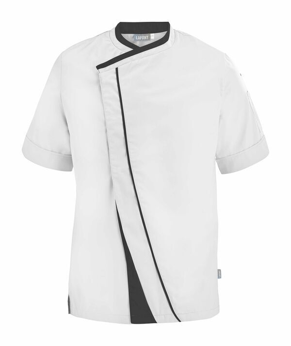 Veste homme à effet double col. Fermeture croisée par grippers cachés, double empiècement milieu dont angle bas contrasté et biais contrasté sur toute la hauteur. Fentes côtés renforcées par un twill jacquard. Oeillets d'aération brodés sous bras. Manches courtes. Bas de manches à revers.