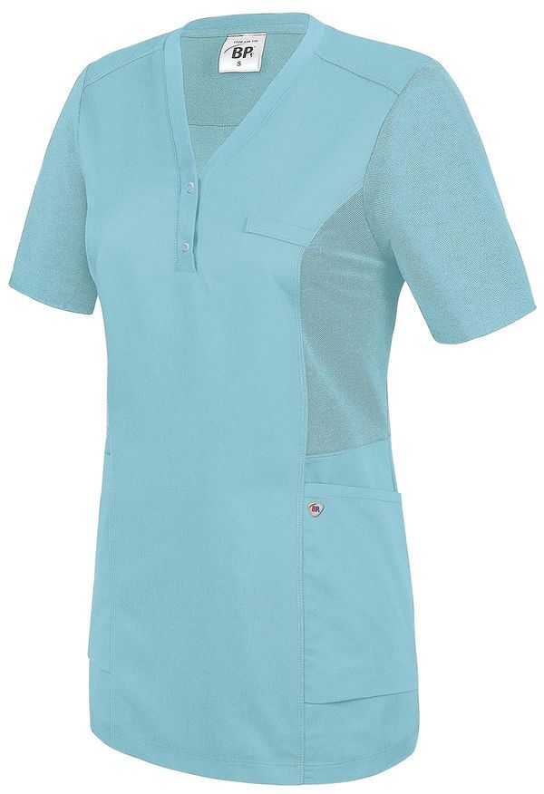 Tunique bi-matière à enfiler coupe femme. Encolure en V avec patte de boutonnage 2 boutons-pression. Empiècements en piqué extensibles sous les aisselles, 2 grandes poches latérales dont 1 avec poche pour bip, passant pour badge. Coupe ajustée. Manches courtes. Longueur : 68 cm.