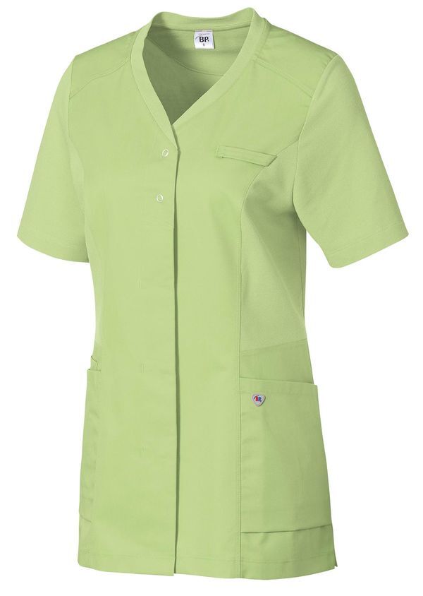 Tunique bi-matière coupe femme. Encolure en V. Fermeture par patte à boutons-pression dissimulée, dont 2 boutons-pression visibles. Empiècements en piqué, 2 grandes poches latérales dont 1 avec poche pour bip, passant pour badge. Manches courtes. Longueur : 68 cm.