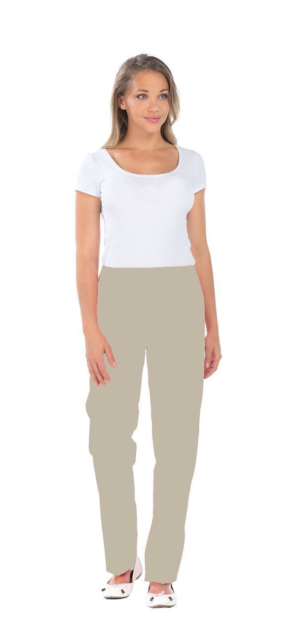 Pantalon femme. Taille semi-élastiquée effet ventre plat. 2 poches italiennes. E.J. : 82 cm.