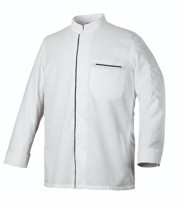 Veste de cuisine bi-matières à col officier. Fermeture milieu devant par boutons-pression cachés. Poche poitrine avec passepoil contrasté. Découpes côtés et empiècement haut du dos en maille. Manches longues avec poche stylo sur manche gauche et fentes sur les poignets. Coupe ajustée.