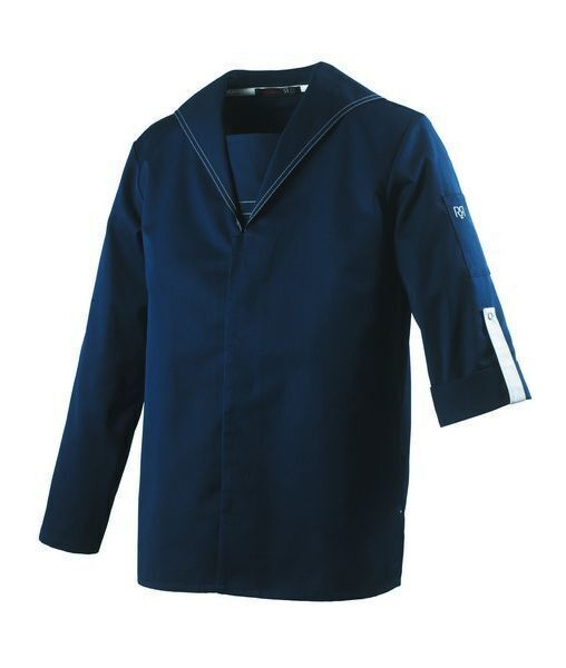 Veste mixte à col marin et bateau au dos. Fermeture milieu devant par boutons-pression cachés. Fentes côtés. Manches retroussables avec pattes contrastées. Poche stylo manche gauche. Surpiqûres contrastées.