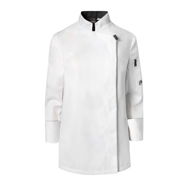 Veste de cuisine femme à col officier. Fermeture asymétrique avec patte en gros grain, 7 boutons-pression cachés. Œillets d'aération. Fentes côtés. Pinces dos. Manches longues avec poche côté gauche dont un compartiment stylo.