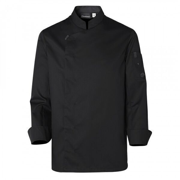 Veste de cuisine homme à col officier. Fermeture asymétrique avec patte en gros grain, 7 boutons-pression cachés. Oeillets d'aération. Fentes côtés. Pinces dos. Manches longues avec poche côté gauche dont un compartiment stylo.