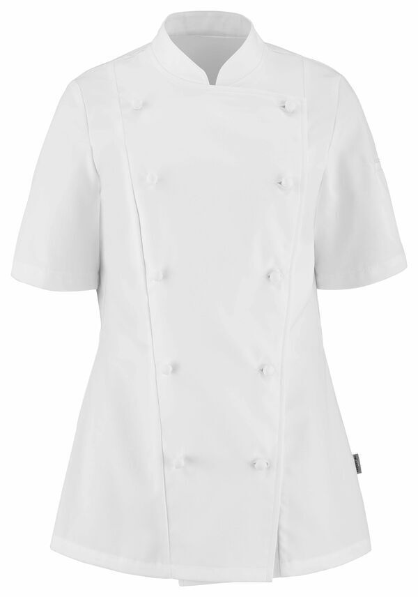 Veste "GRAND CHEF" femme à col officier. Fermeture croisée réversible droite gauche par boutons boules faits et cousus à la main. Plastron liseré satiné. Découpes bretelles devant et dos. Galon Bleu/Blanc/Rouge à l’encolure milieu dos. Œillets brodés sous les bras. Manches courtes, poche stylo à double compartiment sur manche gauche au porter. Finition intérieure coutures gansées.