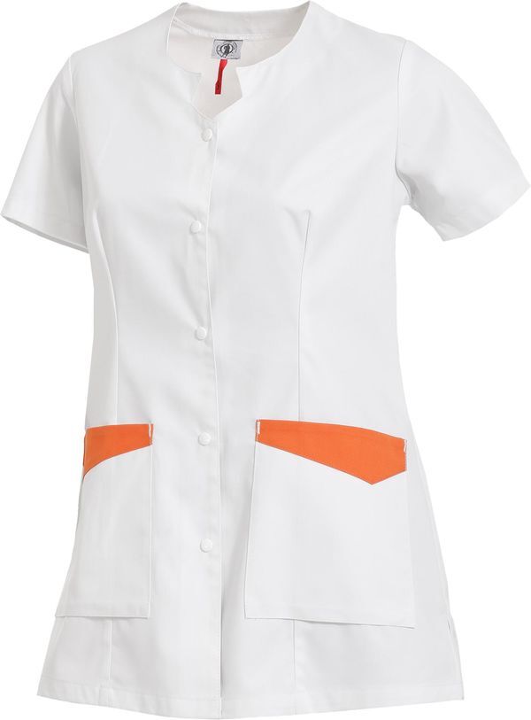 Tunique coupe femme. Encolure fantaisie. Pinces devant et dos. Fermeture devant par pressions plastiques. 2 poches basses, soufflets bas de poche et parements contrastés. Manches courtes. Fentes côtés. Longueur : 76 cm.