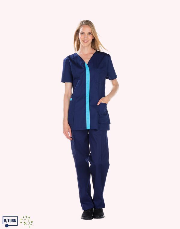 Tunique encolure V. Fermeture milieu devant par boutons-pression, parement contrasté. Découpe de cintrage. Poche poitrine, poche BIP. 2 poches basses semi-volantes. 2 fentes dos. Longueur : 75 cm.