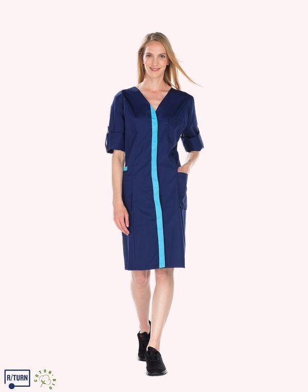 Tunique encolure V. Fermeture milieu devant par boutons-pression, parement contrasté. Découpe de cintrage. Poche poitrine, poche BIP. 2 poches basses semi-volantes. 2 fentes dos. Longueur : 75 cm.