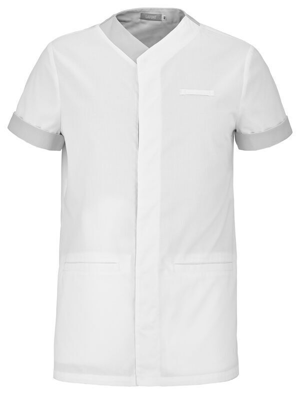 Tunique homme. Fermeture milieu devant par boutons-pression cachés, passant pour porte-badge côté gauche, 2 poches passepoilées dont une à 3 compartiments et 1 passant pendoir côté. Œillets d'aération brodés sous les bras. Manches courtes avec bas de manches revers intérieur contrasté. Longueur : 80 cm.