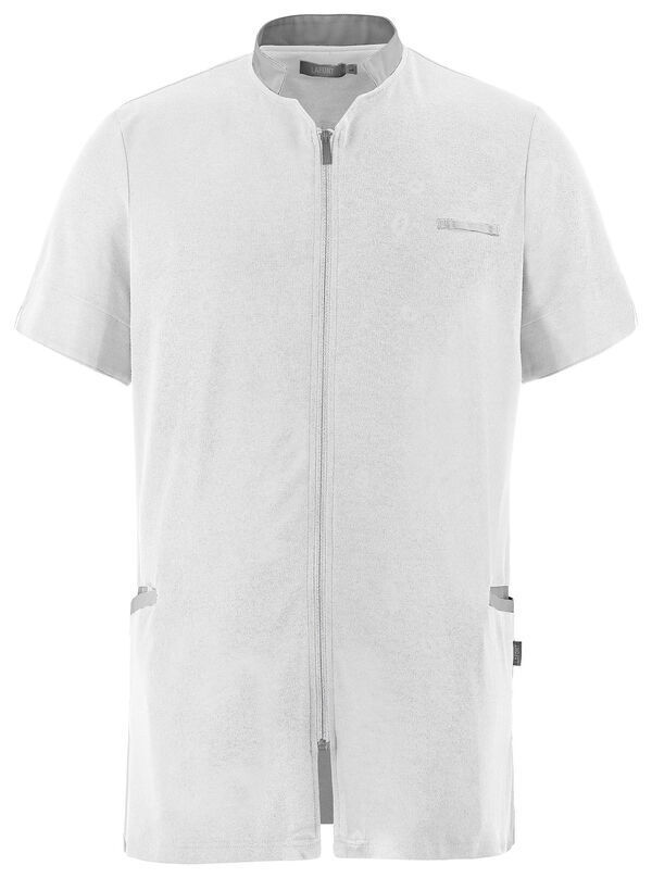 Tunique homme. Col biseauté, fermeture par zip milieu devant. 2 poches côtés et 1 passant pendoir côté droit. Hautes fentes côtés laissant apparaître le fond de poche contrasté. Œillets brodés d'aération sous les bras, manches courtes avec fente biseautée et bas de manches avec parement intérieur contrasté. Longueur : 75 cm.