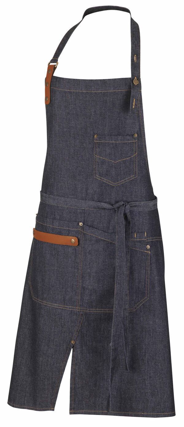 Tablier à bavette. Lien cou réglable par bouton clou et boutonnières. Passant porte-serviette amovible en cuir. 2 grandes poches centrales avec petite poche intérieure et compartiment stylo. Poche poitrine avec surpiqûre fantaisie. Fente de marche. Liens taille à nouer. Surpiqûres contrastées. Longueur : 85 cm.