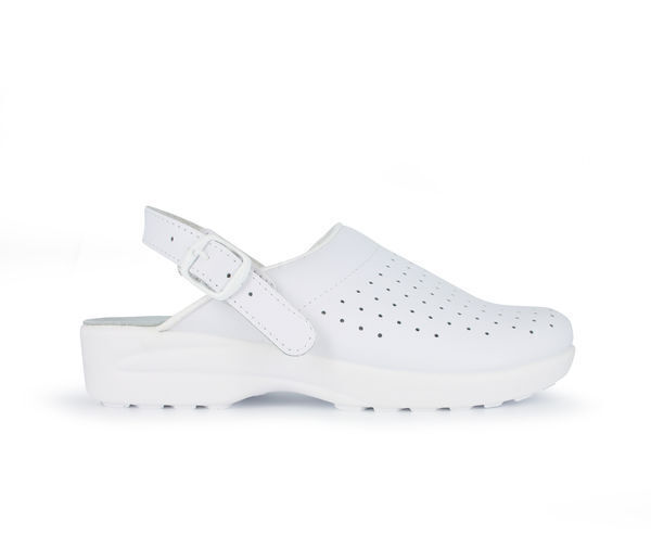 Sabots non sécurité mixte. Tige cuir perforé avec film polyuréthane protecteur. Semelle intérieure cuir de 2 mm cousu avec voûte plantaire. Bride de maintien pivotante, réglable par boucles. Bourrelet de confort au niveau du cou-de-pied. Semelle externe Medicare Sole® polyuréthane mono-densité très souple avec un relief antidérapant. Doublure antibactérienne, antimycosique. Talon : 3,5 cm.