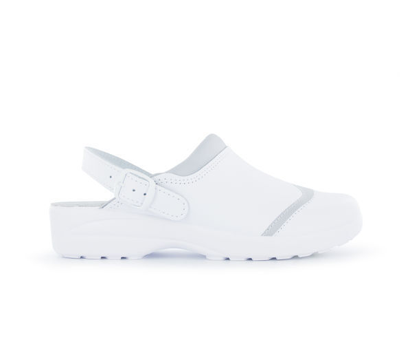 Sabots non sécurité femme. Tige cuir lisse. Doublure antibactérienne. Semelle intérieure cuir avec voûte plantaire. Bride de maintien pivotante, réglable par boucle. Bourrelet de confort. Semelle externe Medicare Sole® polyuréthane mono-densité. Forme demi-compensée. Antimycosique. Talon : 3,5 cm.