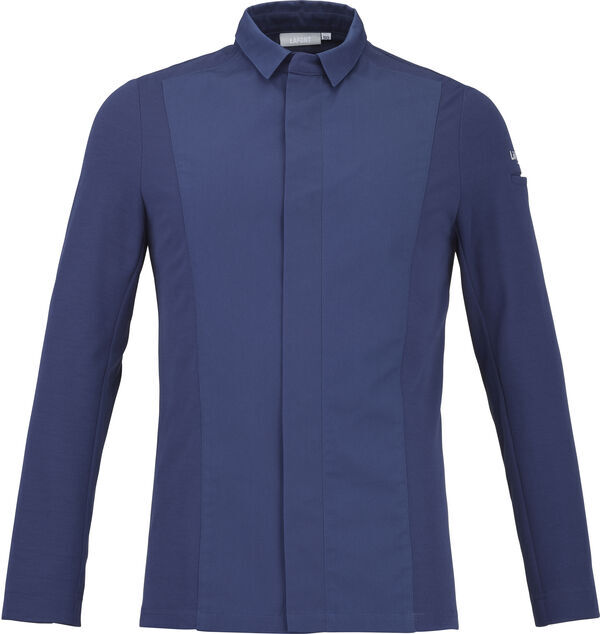 Veste bi-matières homme avec col chemise rabattu. Fermeture milieu devant par boutons-pression cachés. Poche passepoilée sur manche gauche. Ourlet bas de manches 5 cm. Manches et dos en maille piquée. Plastron sergé.