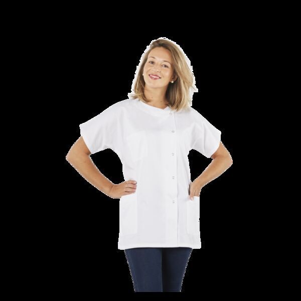 Tunique femme. Col rond. Fermeture asymétrique par 5 pressions calottées. 2 poches plaquées aux côtés. 1 poche poitrine à parement contrasté. Manches kimono. Fente côté. Longueur: 75 cm