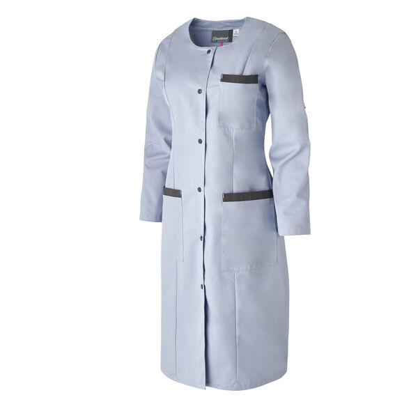 Blouse femme. Encolure ronde, Fermeture milieu par 6 pressions apparentes, Manches transformables, Fentes côtés, 1 poche poitrine sur devant gauche avec parement contrasté, 2 poches basses avec parements contrastés, Découpes bretelles devant et pinces dos. Longueur 105cm