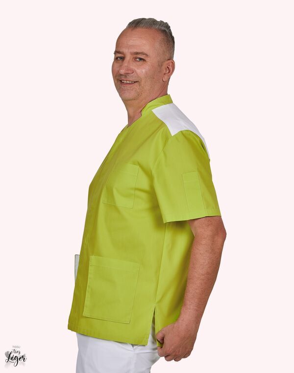 Tunique homme. Fermeture milieu par bouton-pression sous patte. 1 poche poitrine. 2 poches basses à soufflet. Manches courtes. Poche stylo sur manche gauche. Fentes aux cotés. Plis d'aisance dos. Longueur : 78 cm